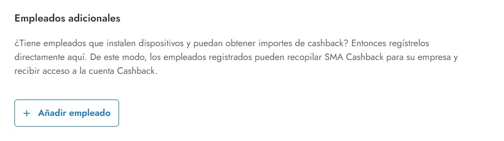 ¡IMPORTANTE! Si lo deseas, puedes añadir a las personas de tu empresa que también quieras que tengan acceso al portal del SMA Cashback. Ten en cuenta que solo habrá una persona administradora que podrá introducir el IBAN bancario pero puede haber tantos usuarios como se desee para registrar equipos en el portal del Cashback.
