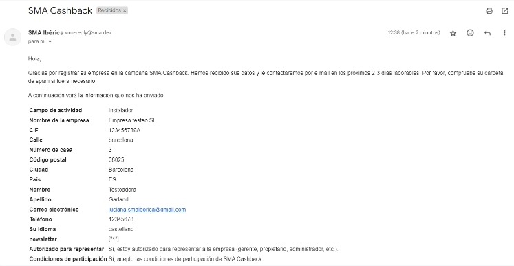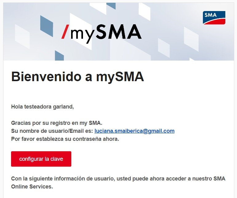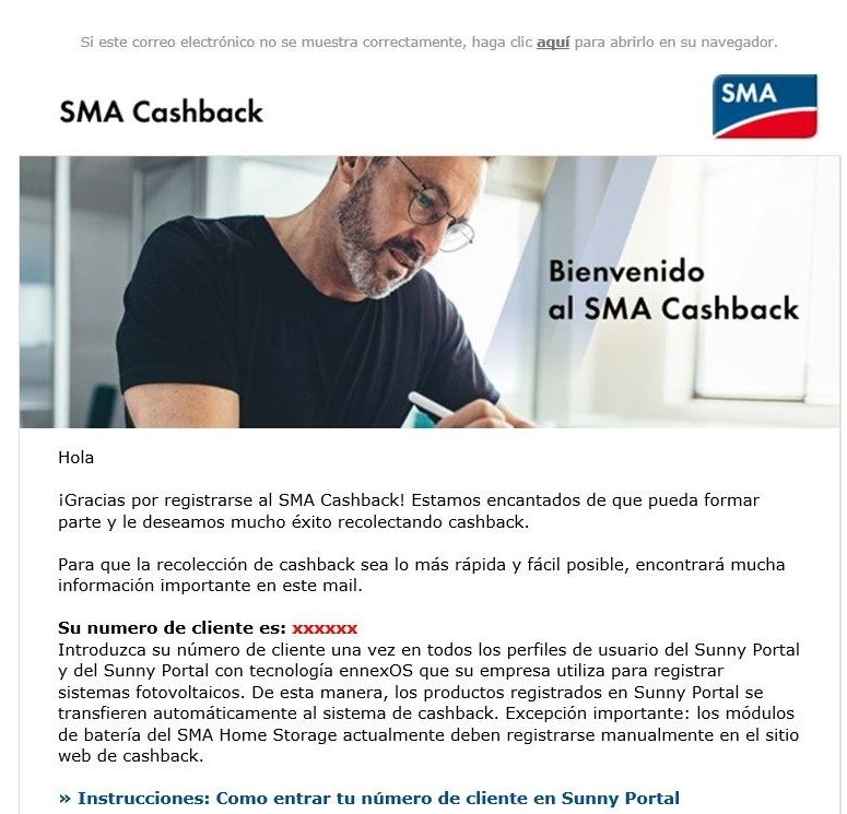 4. En los siguientes días recibirás un email procedente de bonus@sma.de con la información necesaria para el registro en la campaña SMA Cashback. Este correo contendrá el número de cliente SMA que deberás introducir en el Sunny Portal o Sunny Portal Enexos si quieres que el proceso de registro de los equipos sea automático.