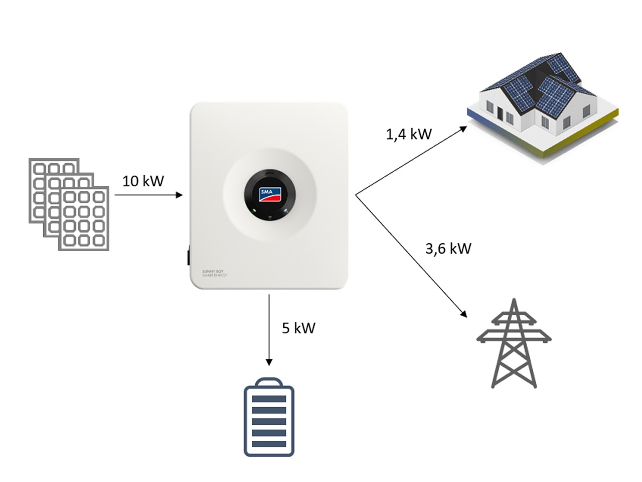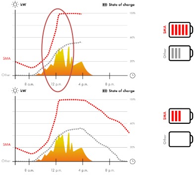De Sunny Boy Smart Energy is een hybride omvormer, wat betekent dat het een combinatie is van een PV-omvormer en een batterijomvormer. De PV-kant maakt overdimensionering tot 200% mogelijk. En als er veel meer elektriciteit beschikbaar is dan nodig om de huishoudelijke apparaten te voeden, kan deze omvormer de batterij opladen en tegelijkertijd het overschot aan elektriciteit aan het net leveren.